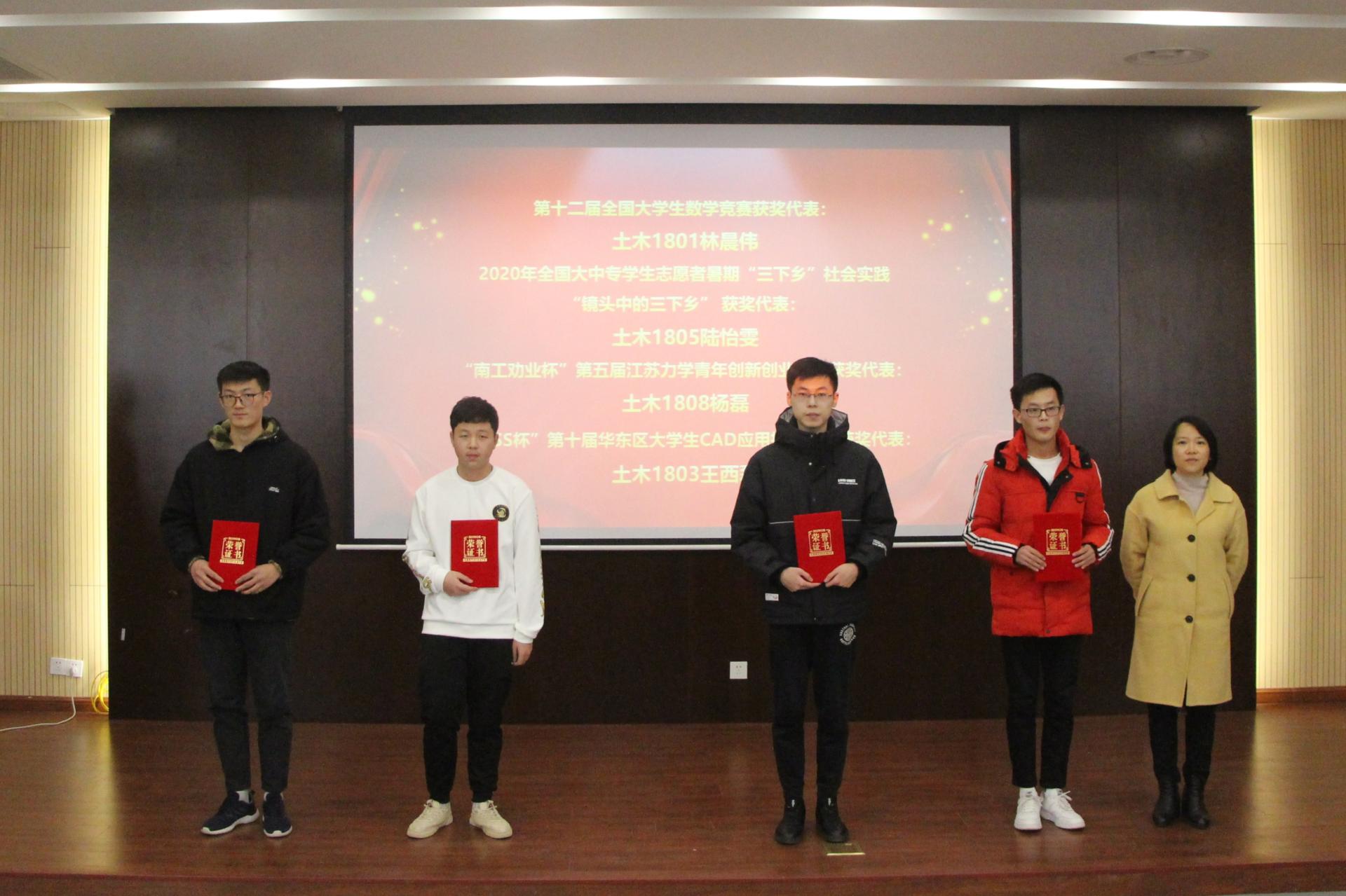 会议在土木类2015班全体同学演唱的《国家》 中拉开序幕,副院长王俊宣读了《yl6809永利官网关于表彰先进集体和先进个人的决定》。随后,学院领导为获得 “国家奖学金”、“江苏省先进班级”、“校大学生年度人物”“校社会实践先进个人”“促学行动先进个人”等获奖学生代表颁发了荣誉证书。