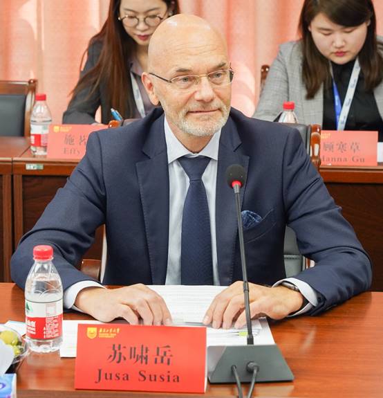 芬兰驻华大使馆Jusa Susia商务参赞对我校的热情接待和精心安排表示感谢,充分肯定了我校现代木结构研究团队在科学研究、标准规范和工程应用等领域的特色和优势,介绍了芬兰森林可持续发展的管理及地理优势、芬兰木材资源及木材特点。商务团各代表分别介绍了企业产品、应用领域和特点优势,表达了积极合作共同推进中国现代木结构发展的愿景。