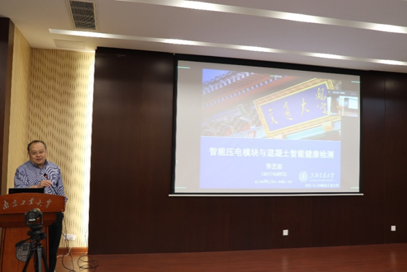 报告会上,乔丕忠教授首先针对混凝土结构的材料老化、结构损伤、抗力衰减等问题介绍了基于应力波传播方法的智能压电传感器。然后分别从应力波传播机理、材料性能评估和结构损伤识别三个方面,详细介绍了基于两种压电传感器(预埋内置式压电传感器和表面粘贴式压电传感器)的混凝土无损检测方法。该方法为智能化无损检测系统的集成奠定了初步基础。