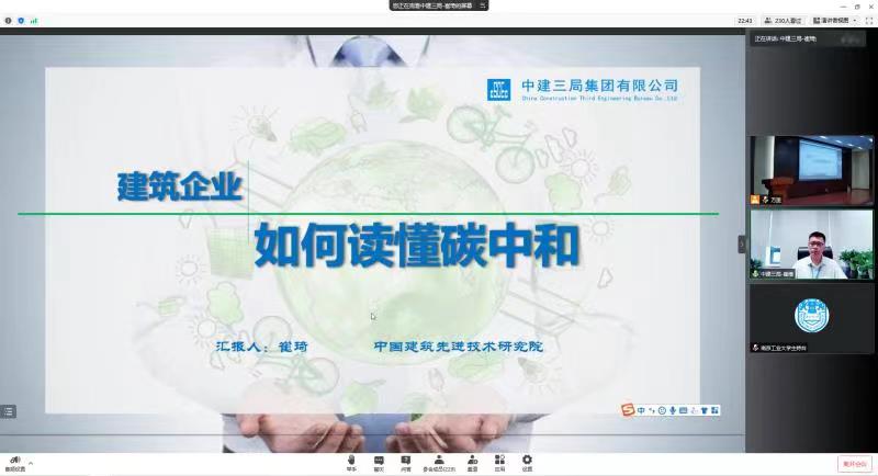 7月15日下午,中国建筑先进技术研究院政策与战略研究所崔琦所长给大家带来了“建筑企业如何读懂碳中和”主题报告,崔所长从碳中和时代背景与基本内涵、中国碳中和的挑战与意义、建筑业绿色低碳发展转型、建筑企业绿色低碳发展路径四个方面给学员们讲解了碳中和相关背景与政策、建筑业应对措施,学员们就双碳目标、减碳目标的评定、减碳可能面临的阻力等问题与专家进行了积极互动。最后,学员在线上参观了中建-南工智慧建造研究中心和江苏省土木工程与防灾减灾重点实验室。